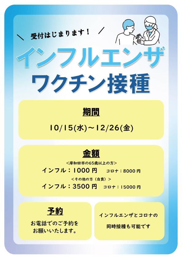 【予約】<岸和田市の65歳以上の方 (自己負担)>◆ インフル: 1,000円◆ コロナ: 8,000円<その他の方 (自費)>◆ インフル: 3,500円◆ コロナ: 15,000円